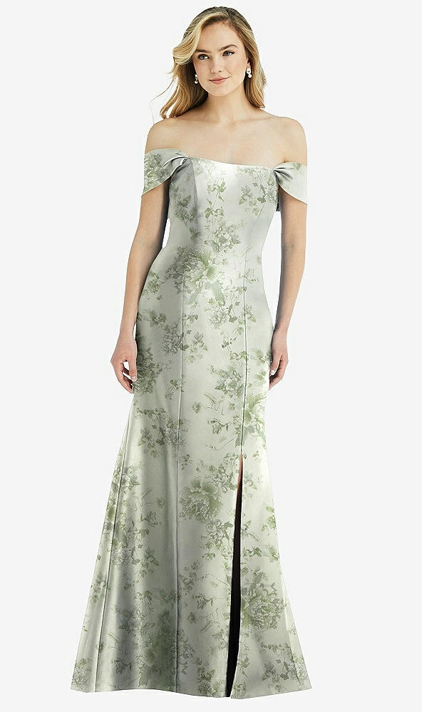 Off-the-Shoulder Bow-Back Floral Satin Trumpet Gown in Sage Cottage Rose