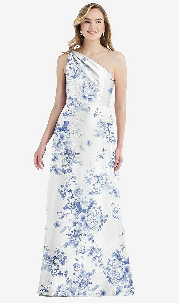 Pleated Draped One-Shoulder Floral Satin Gown with Pockets in Cottage Rose Larkspur