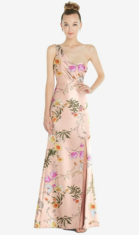 Draped One-Shoulder Floral Satin Trumpet Gown with Front Slit in Butterfly Botanica Pink Sand