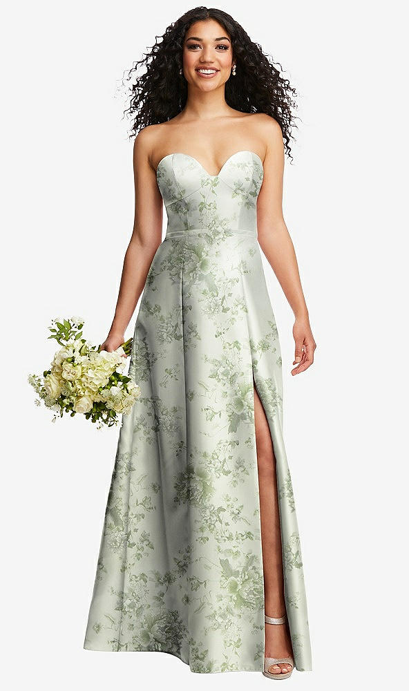 Strapless Bustier A-Line Floral Satin Gown with Front Slit in Sage Cottage Rose