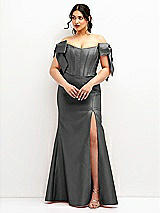 Off-the-Shoulder Bow Satin Corset Dress with Fit and Flare Skirt in Blush