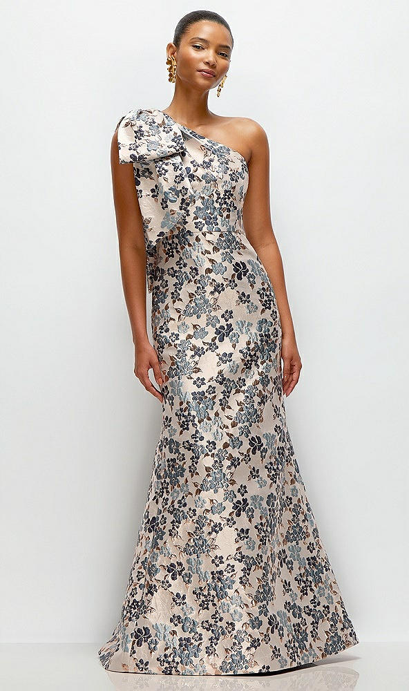 Bow One-Shoulder Gilt Indigo Brocade Floral Maxi Dress with Trumpet Skirt in Indigo Midnight