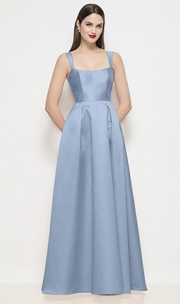 Shaped Strap Basque Neck Satin Maxi Dress with Pleated Skirt in Cloudy
