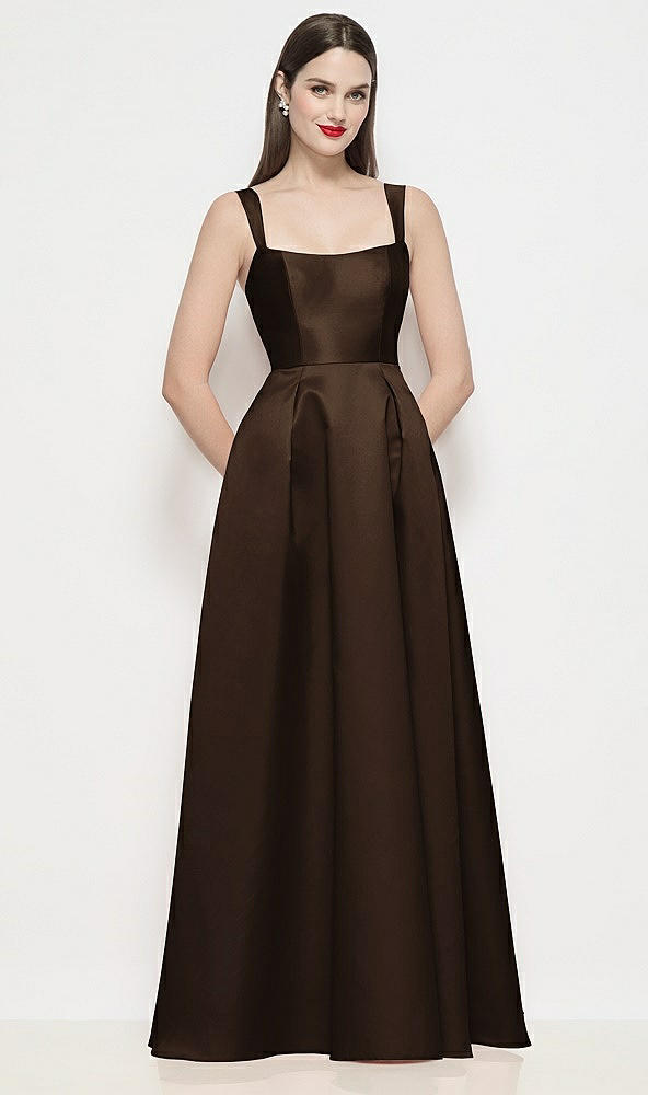 Shaped Strap Basque Neck Satin Maxi Dress with Pleated Skirt in Espresso