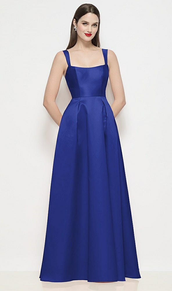 Shaped Strap Basque Neck Satin Maxi Dress with Pleated Skirt in Cobalt Blue