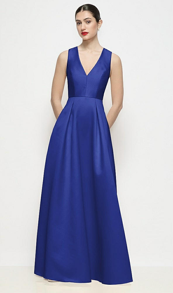 Sleeveless V-neck Satin Maxi Dress with Pleated Skirt in Cobalt Blue
