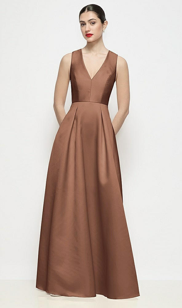 Sleeveless V-neck Satin Maxi Dress with Pleated Skirt in Cognac