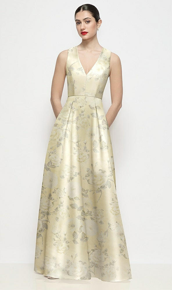Sleeveless V-neck Floral Satin Maxi Dress with Pleated Skirt in Butter Yellow Floral