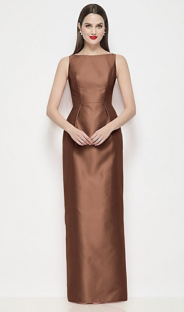 Bateau Neck Satin Maxi Dress with Pleated Column Skirt in Cognac