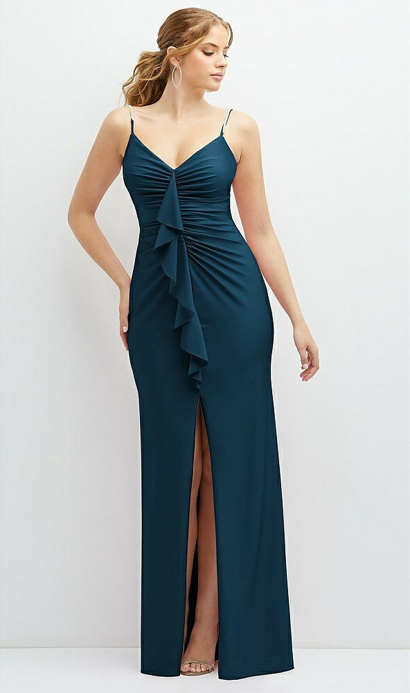 Rhinestone Strap Stretch Satin Maxi Dress with Vertical Cascade Ruffle in Atlantic Blue
