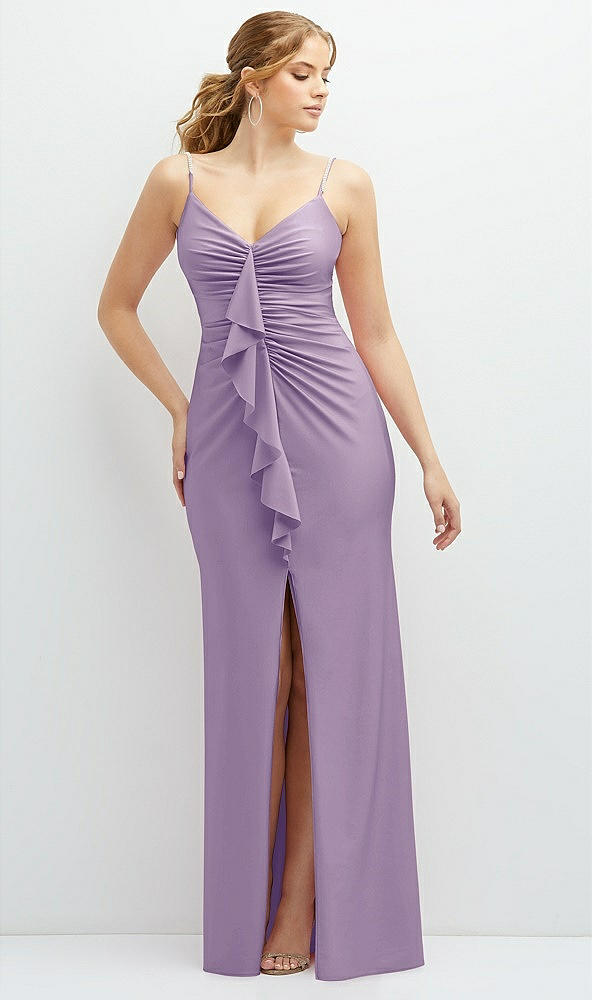 Rhinestone Strap Stretch Satin Maxi Dress with Vertical Cascade Ruffle in Pale Purple