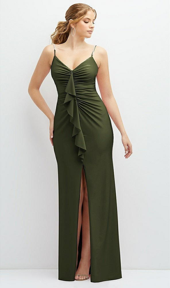 Rhinestone Strap Stretch Satin Maxi Dress with Vertical Cascade Ruffle in Olive Green