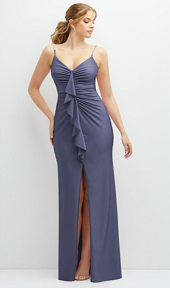 Rhinestone Strap Stretch Satin Maxi Dress with Vertical Cascade Ruffle in French Blue