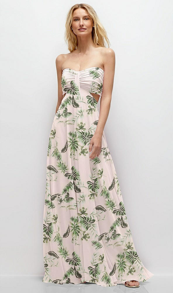 Strapless Empire Waist Cutout Maxi Dress with Covered Button Detail in Palm Beach Print
