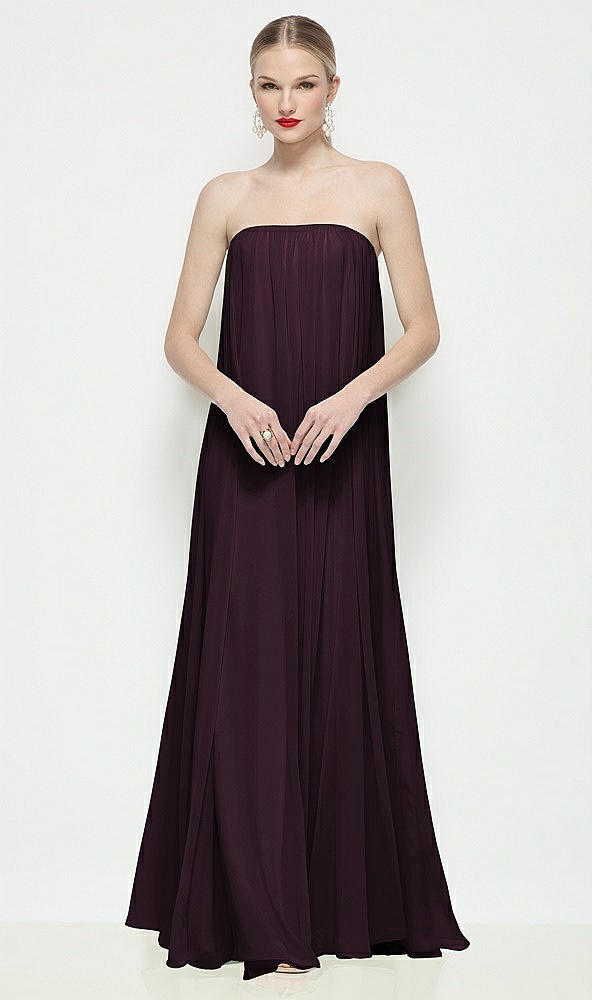 Strapless Shirred Chiffon Trapeze Maxi Dress in Deep Plum