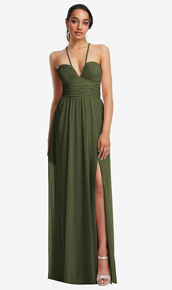 Plunging V-Neck Criss Cross Strap Back Maxi Dress in Olive Green