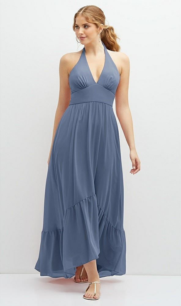 Chiffon Halter High-Low Dress with Deep Ruffle Hem in Larkspur Blue