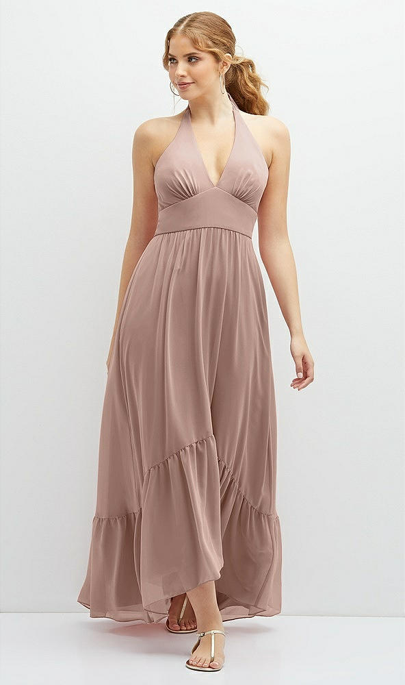 Chiffon Halter High-Low Dress with Deep Ruffle Hem in Neu Nude