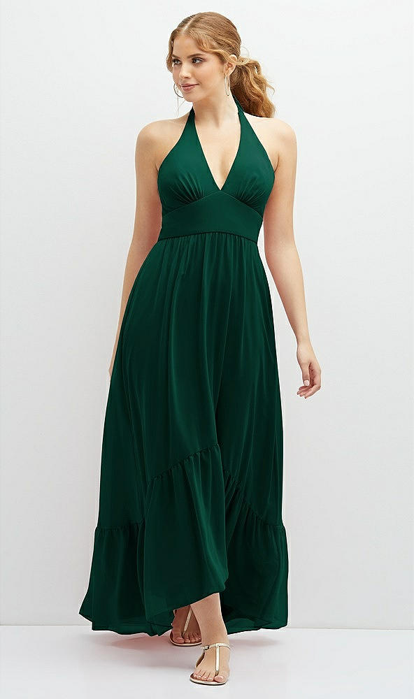 Chiffon Halter High-Low Dress with Deep Ruffle Hem in Hunter Green