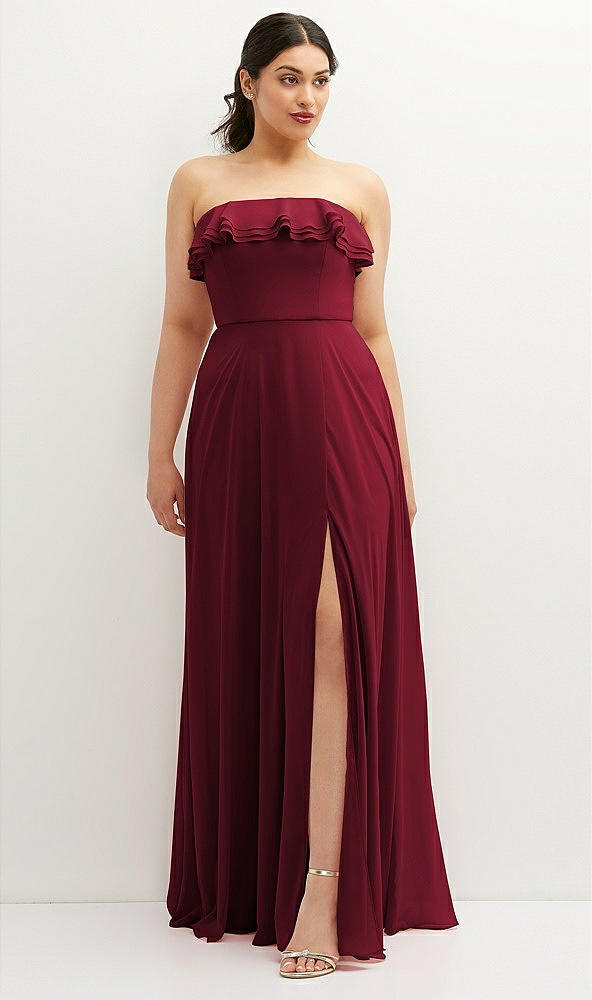 Tiered Ruffle Neck Strapless Maxi Dress with Front Slit in Burgundy