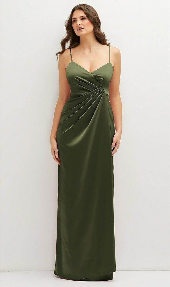 Asymmetrical Draped Pleat Wrap Satin Maxi Dress in Olive Green