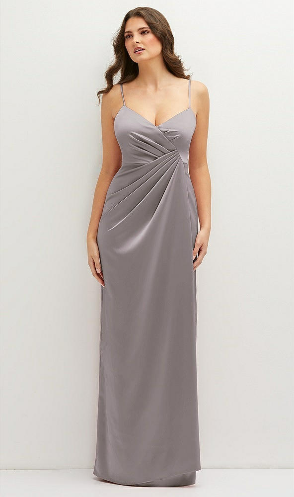 Asymmetrical Draped Pleat Wrap Satin Maxi Dress in Cashmere Gray