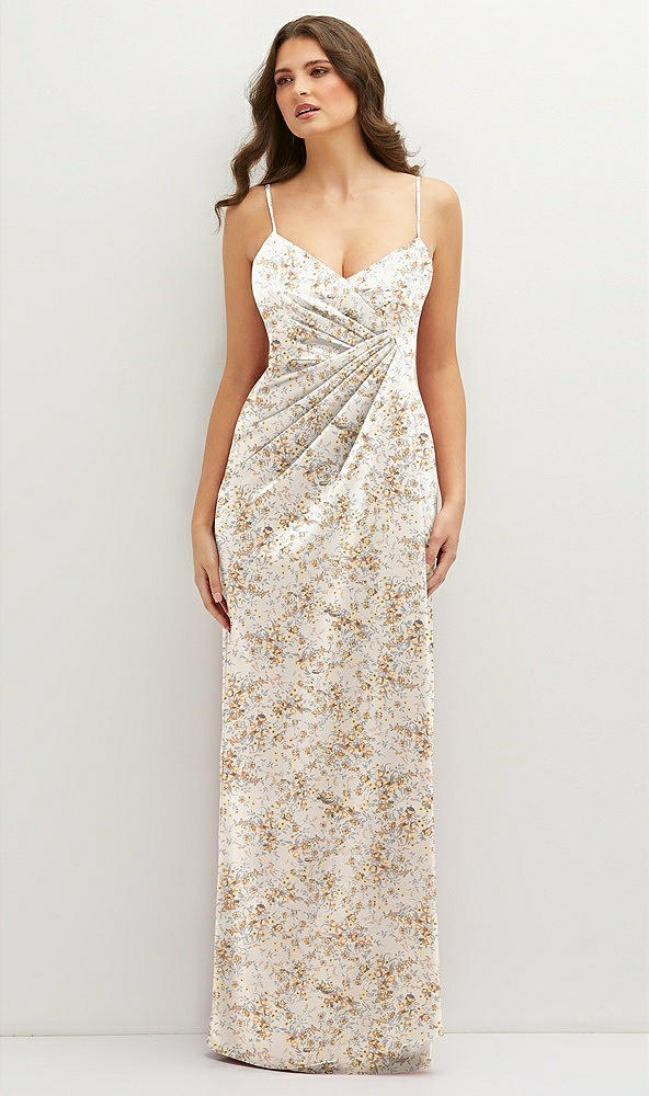 Floral Asymmetrical Draped Pleat Wrap Satin Maxi Dress in Golden Hour
