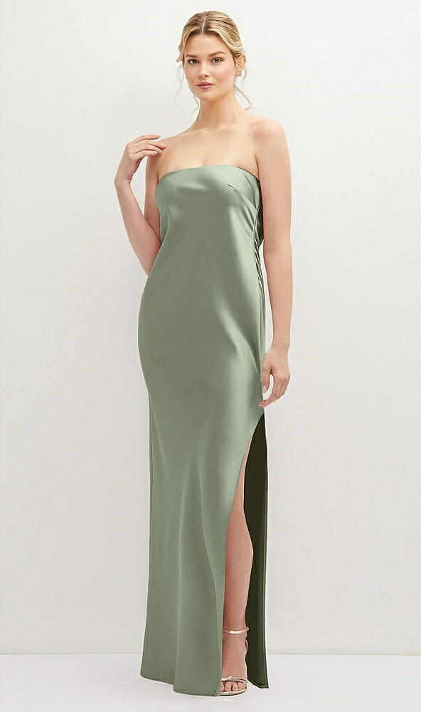 Strapless Pull-On Satin Column Dress with Side Seam Slit in Sage