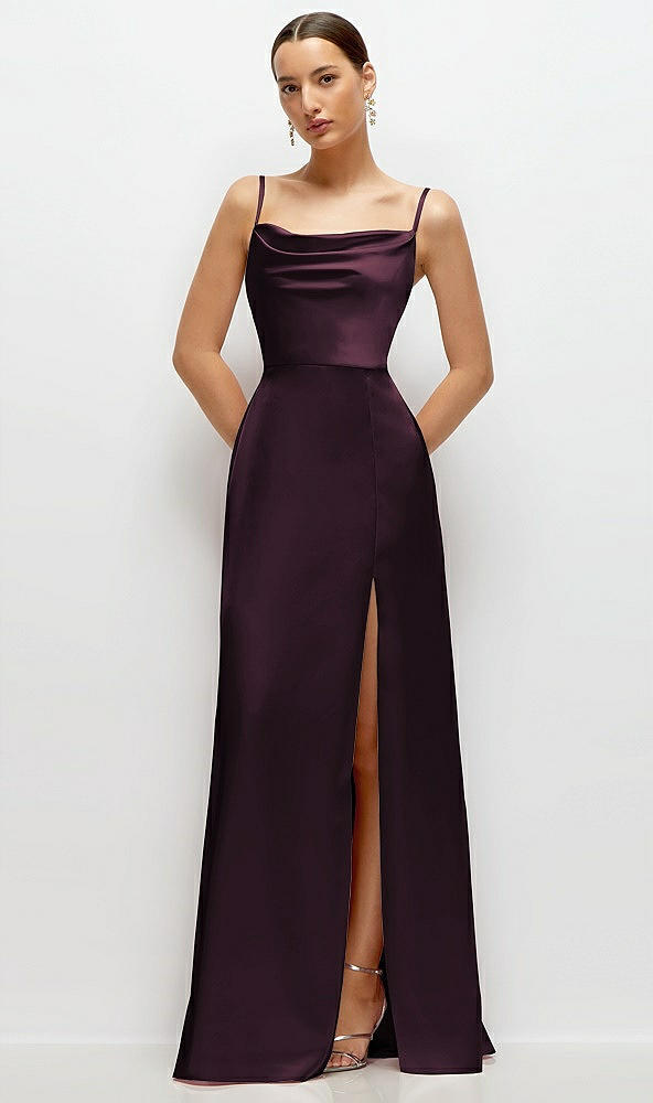 Cowl Neck Satin Maxi Dress with Adjustable Spaghetti Straps in Deep Plum