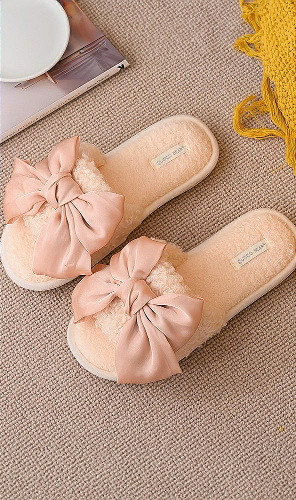 Open-Toe Fluffy Slippers with Silky Knot-Bow for Bridesmaids in Blush