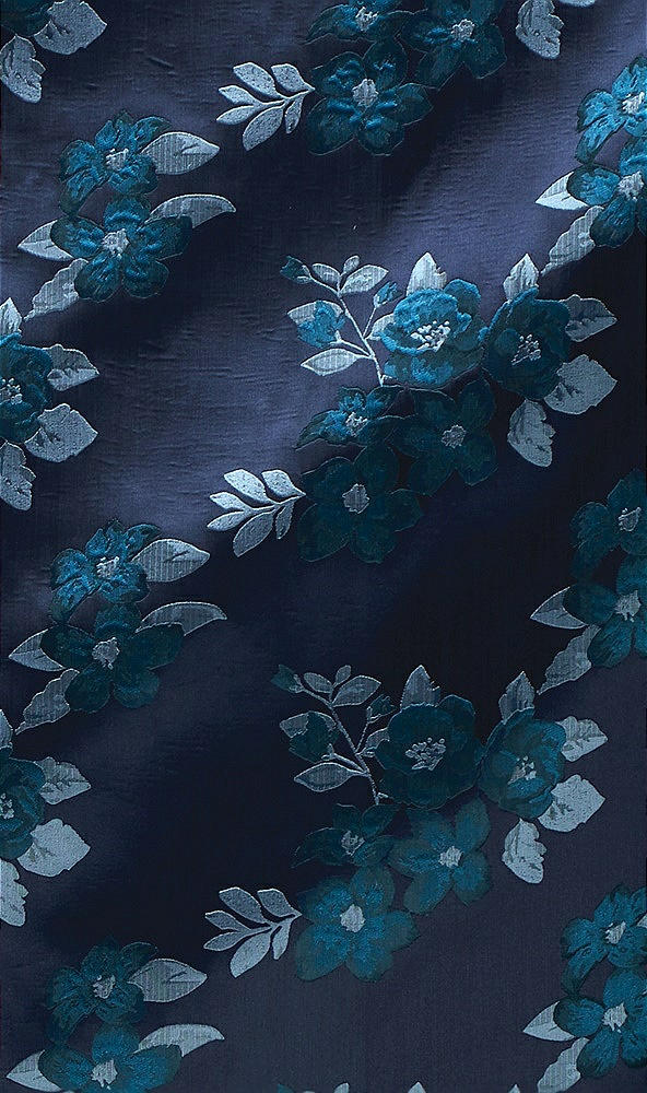 This Midnight Navy Baroque Rose Damask fabric captivates with a fresh, luxe vibe. Its rich deep navy blue backdrop with subtle luster is accented with a woven rose damask floral in shades of dusty blue and saturated teal. Effortlessly mix into any blue bridal party.