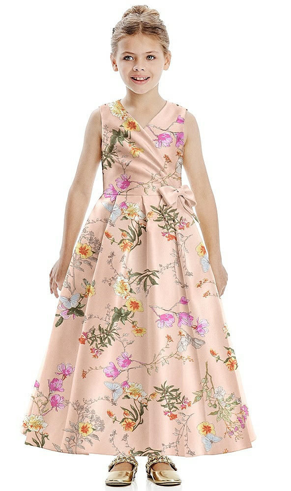 Floral Faux Wrap Pleated Skirt Satin Flower Girl Dress with Bow in Butterfly Botanica Pink Sand
