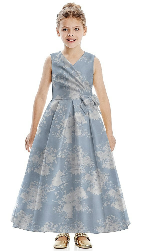 Floral Faux Wrap Pleated Skirt Satin Flower Girl Dress with Bow in Porcelain Blue Seraphina Floral