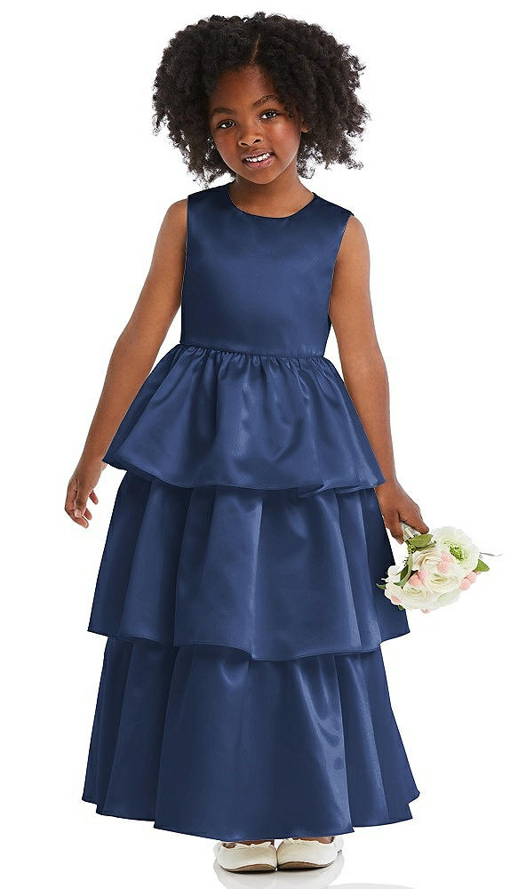 Jewel Neck Tiered Skirt Satin Flower Girl Dress in Sailor
