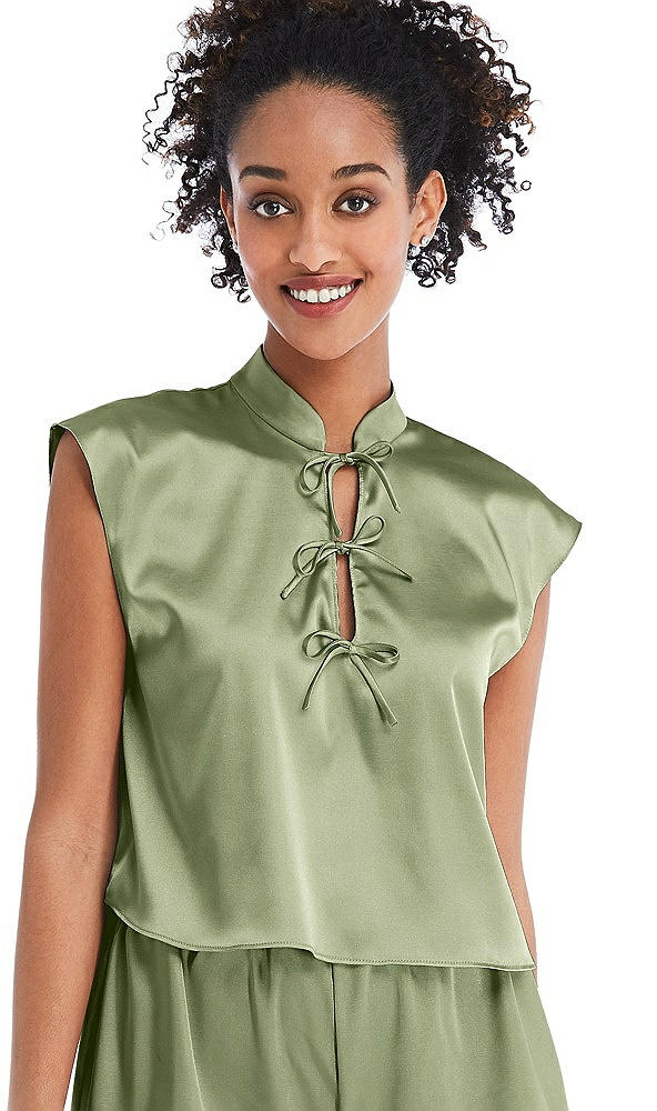 Satin Stand Collar Tie-Front Pullover Top - Remi in Kiwi