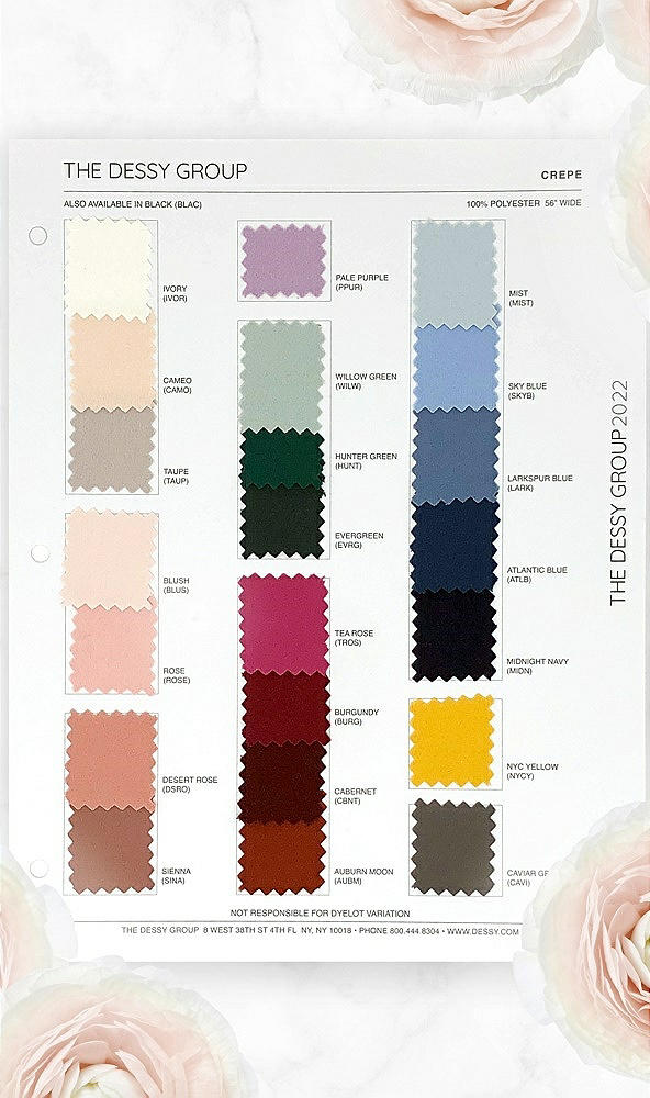 Craft your perfect wedding palette using our Crepe Master Swatch Palette. Our master palettes are the perfect starting point in the wedding planning process. The swatch palettes are made from 8.5" x 11" card stock with individual fabric swatches applied. Colors are subject to change based on our current offerings. All swatch and fabric orders are final sale.