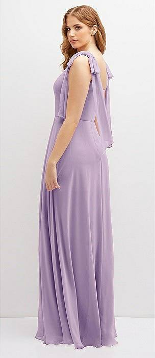 Bow-Shoulder V-Back Chiffon Gown with Front Slit in pale purple