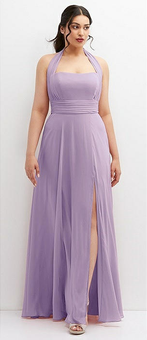 Shirred Skirt Jewel Neck Halter Dress with Front Slit in pale purple
