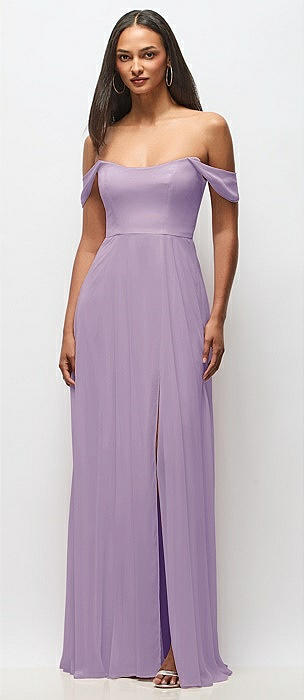 Bow-Shoulder V-Back Chiffon Gown with Front Slit in pale purple