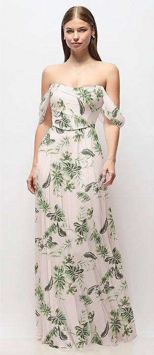 Off-the-Shoulder Basque Corset Floral Chiffon Maxi Dress in palm beach print