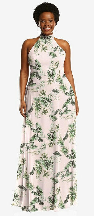Shirred Skirt Jewel Neck Halter Dress with Front Slit in palm beach print