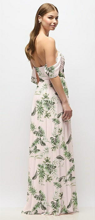 Strapless Pleated Surplice Chiffon Maxi Dress with A-Line Skirt in palm beach print