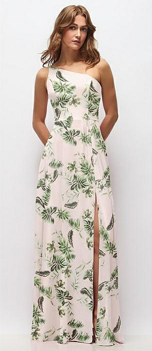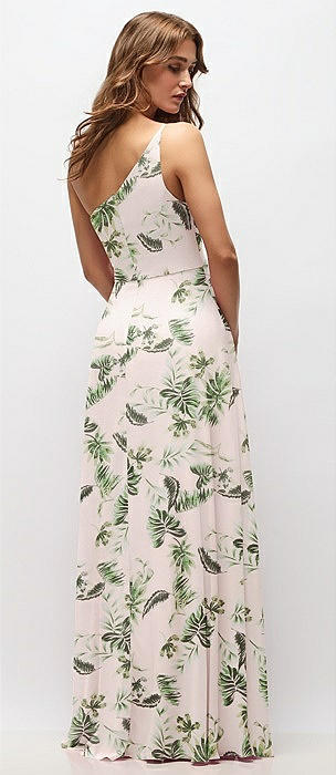 One-Shoulder Chiffon Maxi Dress with Shirred Front Slit in palm beach print