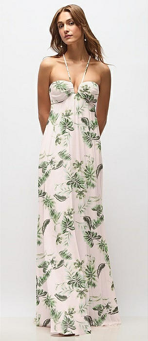 Empire Waist Floral Chiffon Halter Maxi Dress with Convertible Spaghetti Straps in palm beach print