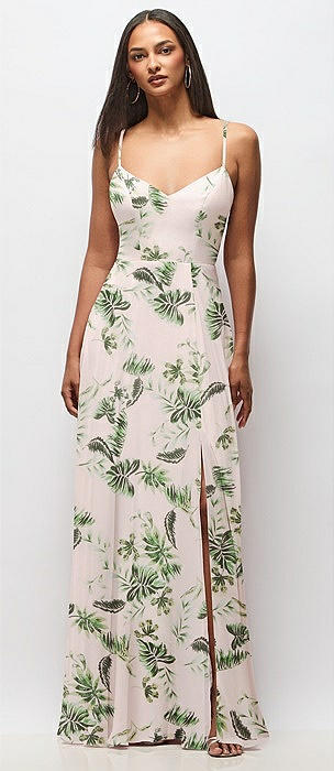 Tie-Shoulder Chiffon Maxi Dress with Front Slit in palm beach print