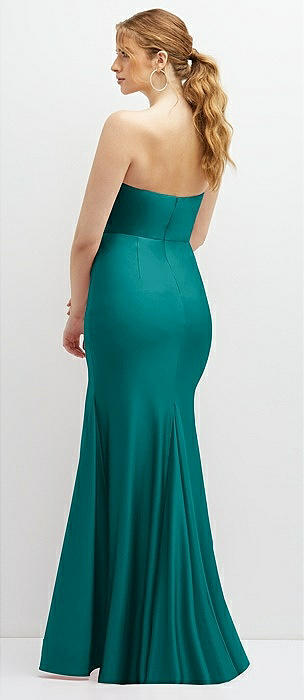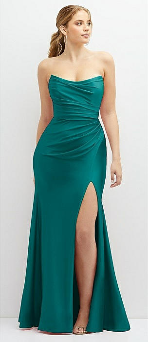 Strapless Basque-Neck Draped Stretch Satin Mermaid Dress with Horsehair Hem in peacock teal