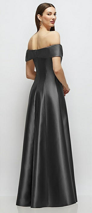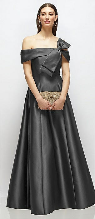 Asymmetrical Bow Off-Shoulder Satin Gown with Ballroom Skirt in pewter