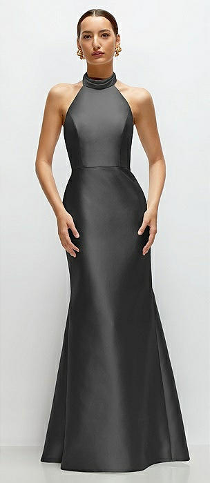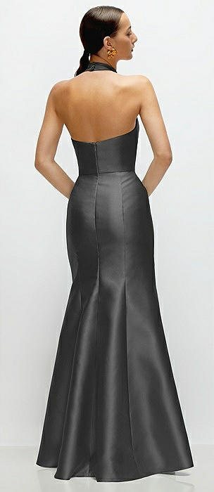 High-Neck Halter Open-Back Satin Trumpet Dress in pewter