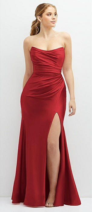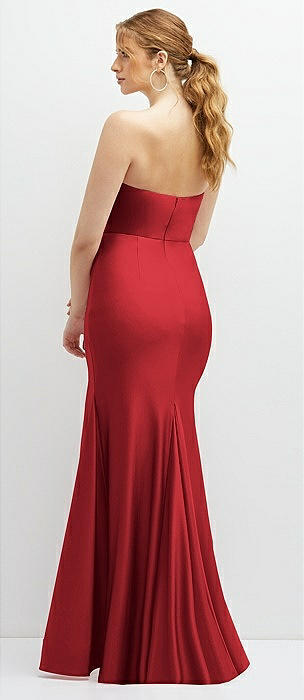 Strapless Basque-Neck Draped Stretch Satin Mermaid Dress with Horsehair Hem in poppy red