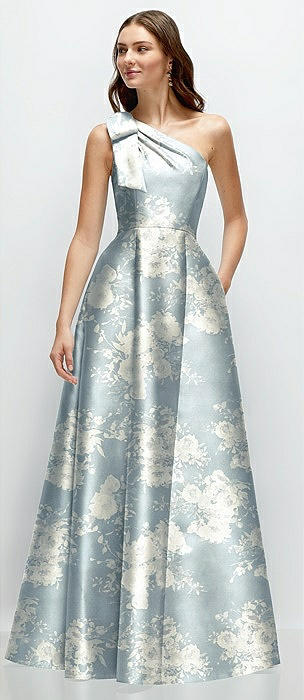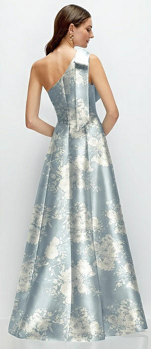Bow One-Shoulder Floral Satin Trumpet Gown in porcelain blue seraphina floral